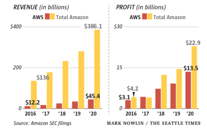 ('20년 기준으로 수익의 59%를 AWS가 담당, 매출 비중 상으로는 12%로 매우 수익성 높은 비즈니스임)